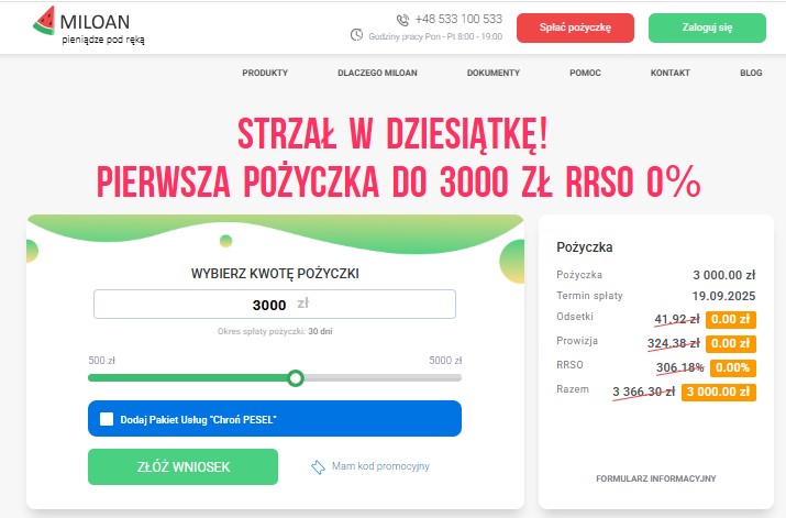 08.09.2021 14:15 Wszystko przez Internet od początku do końca – dla mnie to bardzo wygodnie. Dobra strona, prosta a czytelna. Nie treba się męczyć tymi groszowymi przelewami. Polecam ten Miloan.