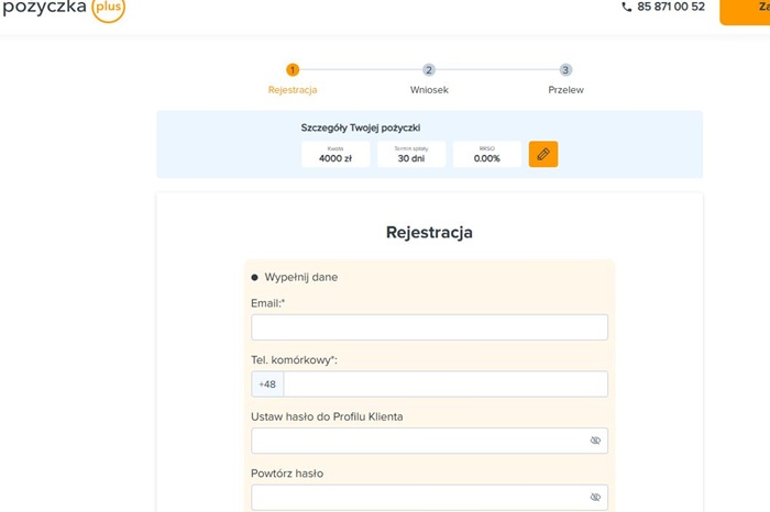 Rejestracja konta w Pożyczka Plus – krok po krokuAby założyć konto i złożyć wniosek o pożyczkę na stronie pozyczkaplus.pl, wykonaj poniższe kroki: 1. Wybór kwoty i okresu pożyczkiNa stronie głównej Pożyczka Plus wybierz interesującą Cię kwotę pożyczki oraz okres spłaty, a następnie kliknij przycisk „Weź pożyczkę”. 2. Podanie danych kontaktowych