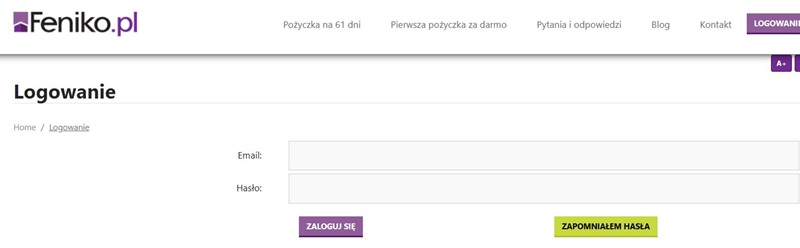 Weryfikacja tożsamości klienta FenikoWeryfikacja przeprowadzana jest za pośrednictwem serwisu Blue Media. firma ta gwarantuje bezpieczeństwo danych osobowych. Informacje wykorzystywane do weryfikacji tożsamości klienta nie są przechowywane ani wykorzystywane do innych celów. Opłata za sprawdzenie wynosi 1 zł. Należy pamiętać, że przelew weryfikacyjny musi być dokonany z tego samego konta bankowego, którego numer podamy we wniosku kredytowym. Logowanie do panelu użytkownika